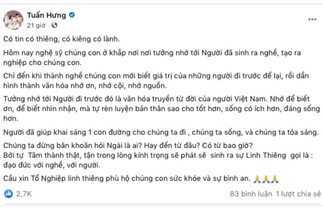 Hòa chung với không khí đó, nam ca sĩ Tuấn Hưng đã đăng tải lên trang cá nhân: "Chỉ đến khi thành nghề, chúng con mới biết giá trị của những người đi trước để lại, rồi dần hình thành văn hóa nhớ ơn, nhớ cội, nhớ nguồn.