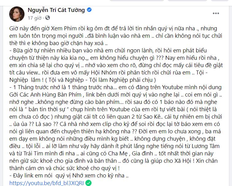 Để đính chính lại thông tin, MC Cát Tường cũng chia sẻ lại đường link video mình từng phát ngôn để khán giả có thể đối chiếu nội dung với lời nhắn nhủ: “Cả nhà nhớ xem lại clip của tôi rồi đọc lại trang tin đó xem có gì liên quan không. Đời tôi còn lo chưa xong, ba mẹ tôi dạy không nói những điều mình không biết, không dựng chuyện, đặt điều vì tội lỗi lắm. Ai đã làm như vậy thì hãy dành ít phút lắng nghe tiếng nói từ lương tâm và trái tim mình đi”.