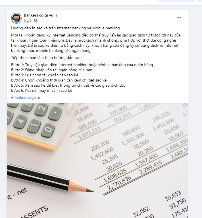 Mới đây, vào ngày 4/9, trên trang fanpage “Banker có gì vui” (dành cho các người hoạt động, làm việc trong lĩnh vực ngân hàng) đã đăng tải bài viết hướng dẫn in sao kê qua Internet banking và Mobile banking mà không cần ra ngân hàng.