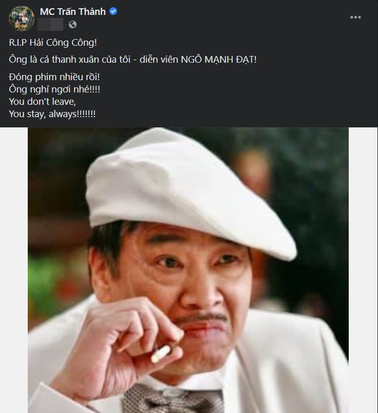 Ở Việt Nam, các sao Việt cũng vô cùng đau lòng, đồng loạt gửi lời vĩnh biệt đến huyền thoại phim Châu Tinh Trì. 1 ngày sau khi Ngô Mạnh Đạt qua đời, Trấn Thành chia sẻ trên trang cá nhân hình ảnh của ông kèm chú thích: “R.I.P Hải Công Công! Ông là cả thanh xuân của tôi – diễn viên Ngô Mạnh Đạt! Đóng phim nhiều rồi! Ông nghỉ ngơi nhé! You don’t leave, you stay, always!”.
