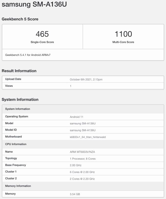 Điểm số cho thấy A13 5G quản lý 465 điểm lõi đơn và 1.106 điểm trong bộ phận đa lõi. Nó được trang bị chipset ARM MT6833V hay còn gọi là MediaTek Dimensity 700. Đó là bộ xử lý tám lõi có tốc độ xung nhịp 2,2 GHz và đi kèm với hai lõi hiệu quả có tốc độ 2 GHz.
