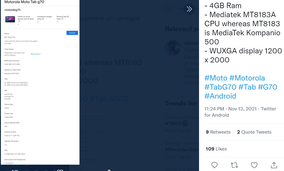 Motorola dự kiến sẽ tung ra thị trường một chiếc máy tính bảng giá rẻ mới. Hôm nay, Motorola Moto Tab G70 đã xuất hiện trên danh sách Google Play Console tiết lộ các thông số kỹ thuật chính của thiết bị.