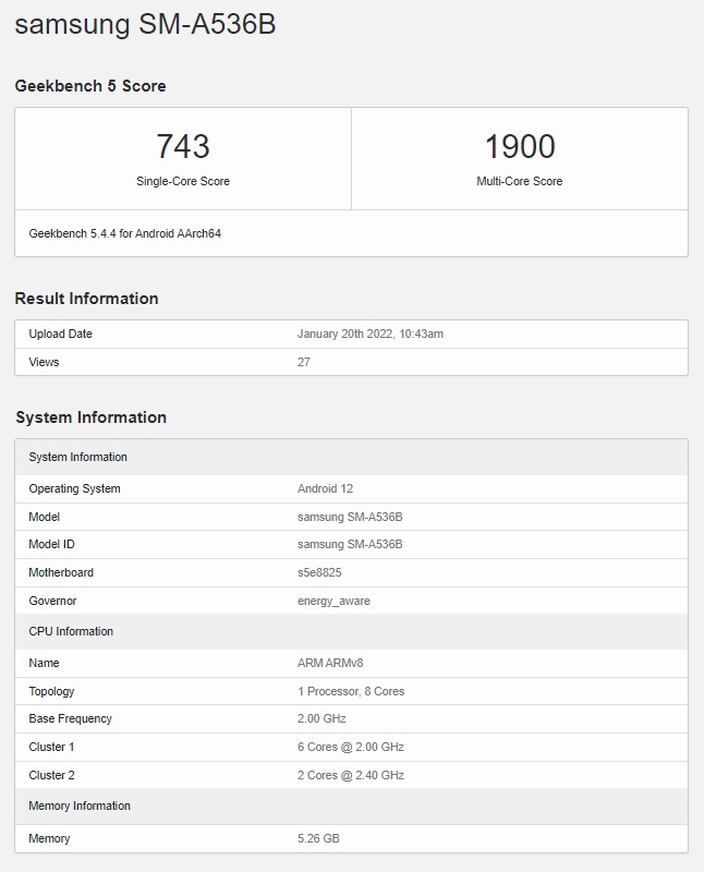Phiên bản quốc tế của Galaxy A53 (SM-A536B) đã xuất hiện trong cơ sở dữ liệu của Geeekbench. Điện thoại thông minh có bộ vi xử lý Exynos 1200 (s5e8825), với hai lõi CPU tốc độ 2,4 GHz và sáu lõi CPU tốc độ 2 GHz. Chipset này cũng có GPU Mali-G68 và kết nối 5G. Nó ghi được 743 điểm trong bài kiểm tra CPU đơn nhân và 1.900 điểm trong bài kiểm tra đa lõi.