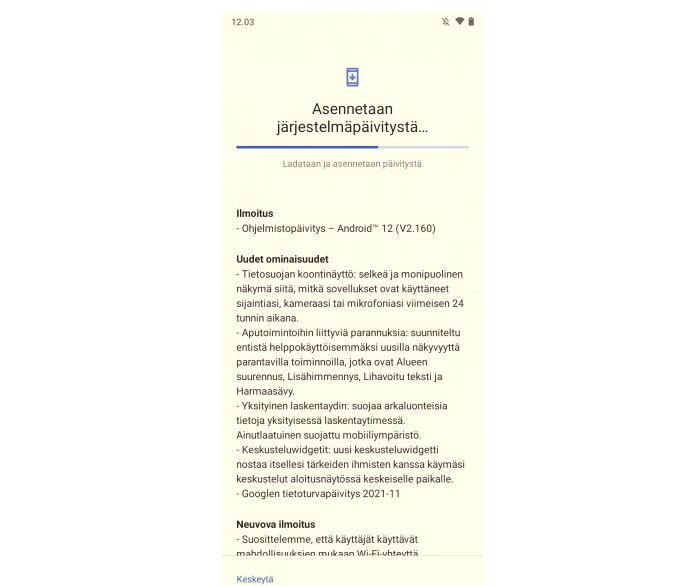 Bản cập nhật Android 12 của Nokia G50 yêu cầu tải xuống dung lượng 2,09GB. Nó có số phiên bản V2.160 và đi kèm với bản vá bảo mật Android tháng 11 năm 2021. Về cơ bản nó là Android 12 gốc được rút gọn (Android 12 Go) khác với các tùy biến giao diện như One UI 4 của Samsung hay MIUI 13 của Xiaomi