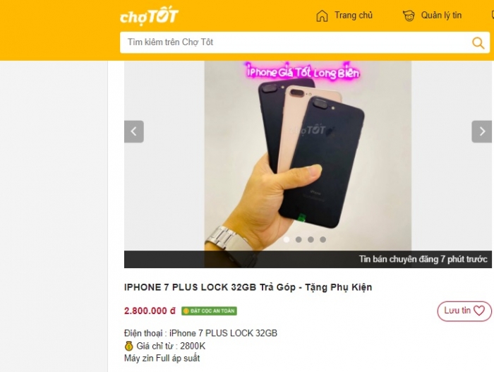 Mới đây trên nền tảng mua bán chotot đã đăng tải bài viết rao bán iPhone 7 Plus và nhận được sự chú ý lớn của người dùng vì mức giá rẻ bất ngờ cho một siêu phẩm ra mắt từ tháng 9/2016 tức là đã hơn 5 năm tuổi. Những chiếc iPhone 7 Plus được rao bán với giá chỉ từ 2.8 triệu đồng. Theo mô tả, đây là iPhone 7 Plus Lock (khóa mạng) nhưng có thể dùng bình thường với SIM ghép. Toàn bộ máy được quảng cáo là máy zin Full áp suất, chưa từng được thay màn hình hay main.