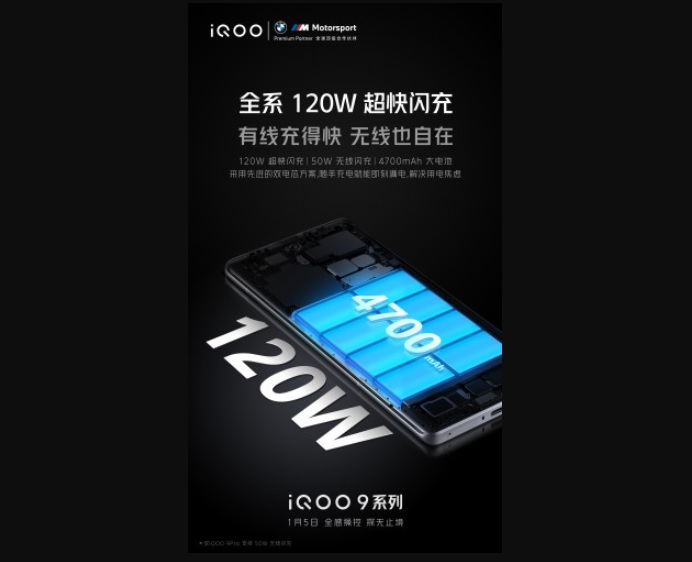 iQOO cho biết dòng iQOO 9 sẽ có pin 4.700 mAh và có tính năng sạc nhanh có dây 120W và không dây đến 50W. Tuy nhiên, chỉ có phiên bản Pro mới hỗ trợ sạc không dây, điều này không có gì ngạc nhiên vì iQOO 8 Pro cũng đi kèm với sạc không dây 50W nhưng iQOO 8 thông thường thì không.