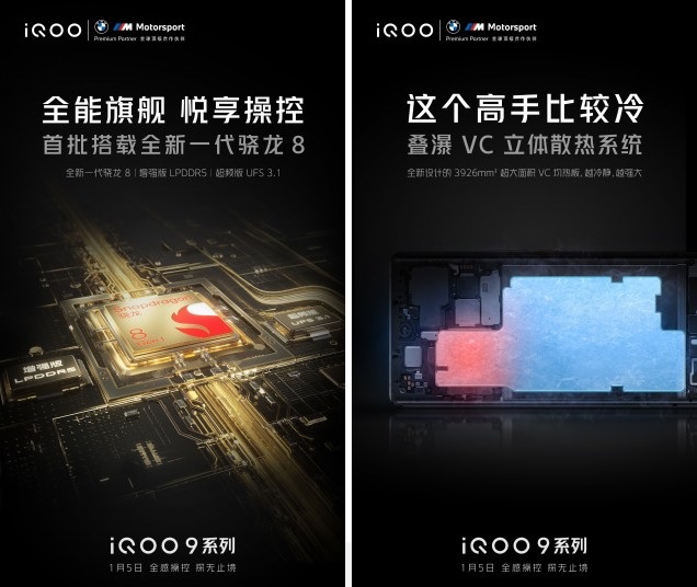 Trong một bài đăng riêng, iQOO cho biết rằng chip Snapdragon 8 Gen 1 SoC trên iQOO 9 series sẽ được ghép nối với "phiên bản nâng cao" gồm RAM LPDDR5 và "phiên bản ép xung" của bộ nhớ UFS 3.1. Chưa rõ cấu hình này sẽ mạnh mẽ tới mức nào.