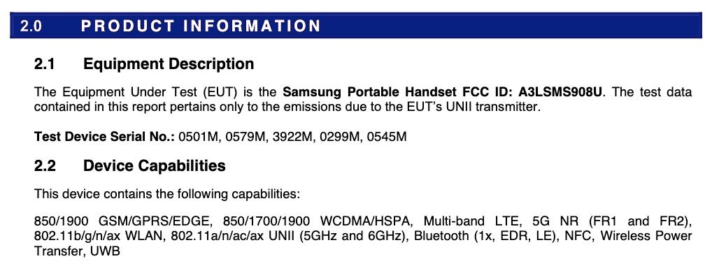 Bên cạnh đó, FCC đã chứng nhận điện thoại thông minh SM-S908U, đó là Galaxy S22 Ultra (cũng được báo cáo là sẽ được đổi tên thành Note), cùng với "stylus pen" mã EJ-PS908, rõ ràng là một chiếc S Pen mới, vì số kiểu máy không phù hợp với bất kỳ sản phẩm trước đây của Samsung.
