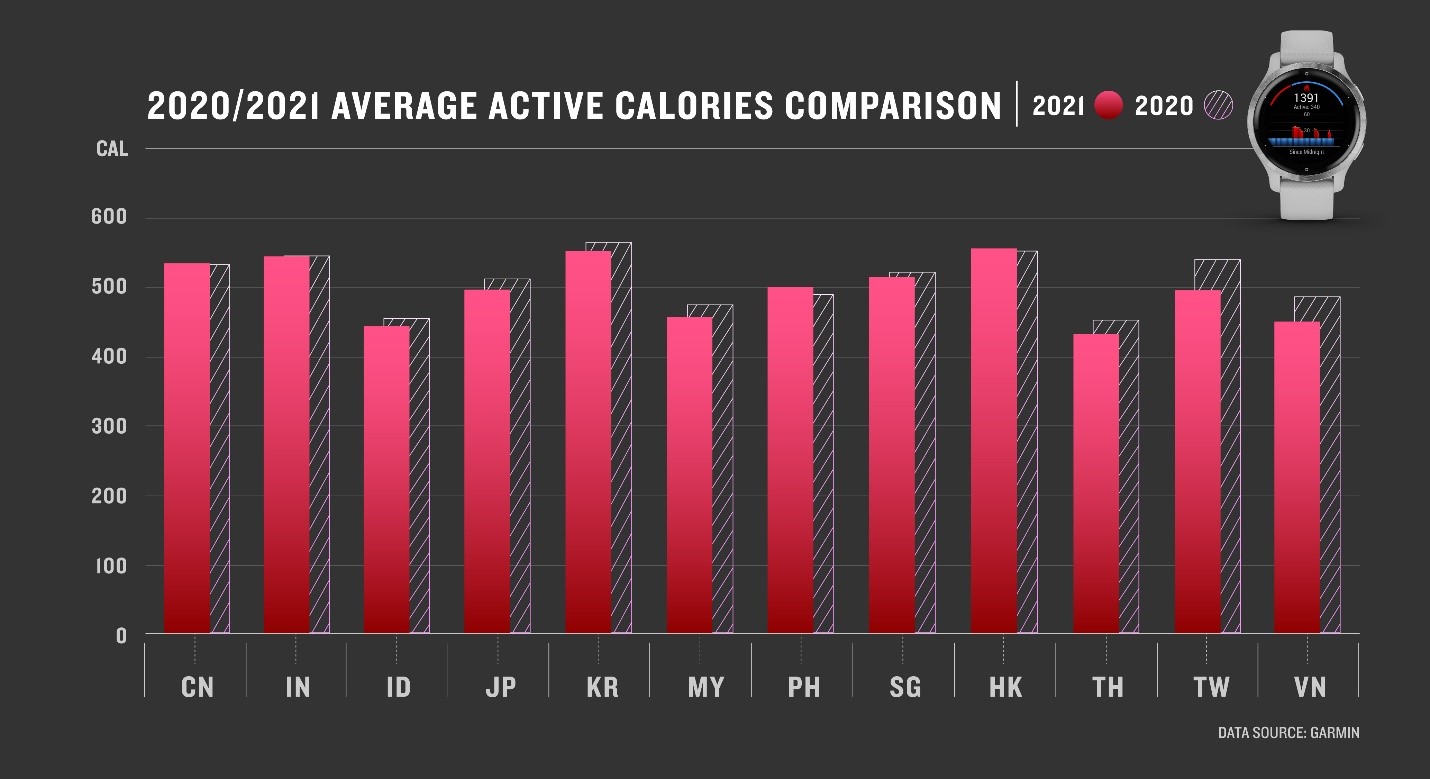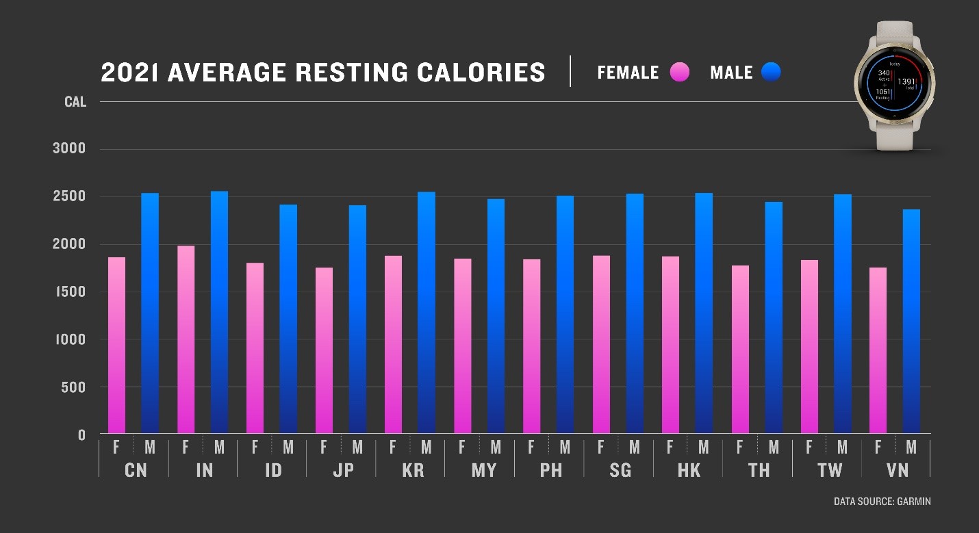 Dựa trên dữ liệu “Lượng calo nghỉ ngơi” của người dùng Châu Á năm 2021, Garmin nhận thấy Việt Nam xếp thứ 03 trong số các nước có lượng calo nghỉ ngơi trung bình thấp nhất khu vực, chỉ 2287 Cal. Nam giới có lượng calo nghỉ ngơi trung bình (2366 Cal), cao hơn tương đối nhiều so với nữ giới (1757 Cal).