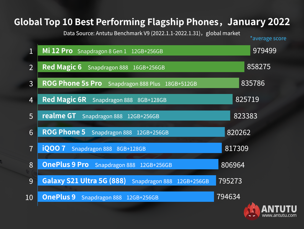 Bảy sản phẩm tiếp theo là Red Magic 6R với điểm trung bình là 825,719, realme GT với điểm trung bình là 823,383, ROG Phone 5 với điểm trung bình là 820,262, iQOO 7 với điểm trung bình là 817,309, OnePlus 9 Pro với điểm trung bình là 806,964, Galaxy S21 Ultra 5G (888) với điểm trung bình là 795,273, OnePlus 9 với điểm trung bình là 794,634.