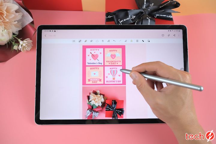 Sử dụng điện thoại Galaxy chụp ảnh kết hợp với Galaxy Tab S7 FE, bạn dễ dàng copy ảnh từ điện thoại paste sang máy tính bảng, tha hồ trang trí, vẽ vời trên màn hình lớn 12.4 inch máy tính bảng nhờ tính năng Copy & Paste độc quyền. Sau đó dùng S Pen để thoải mái sáng tạo trang trí, viết lên những lời yêu dành tặng cho người thương.
