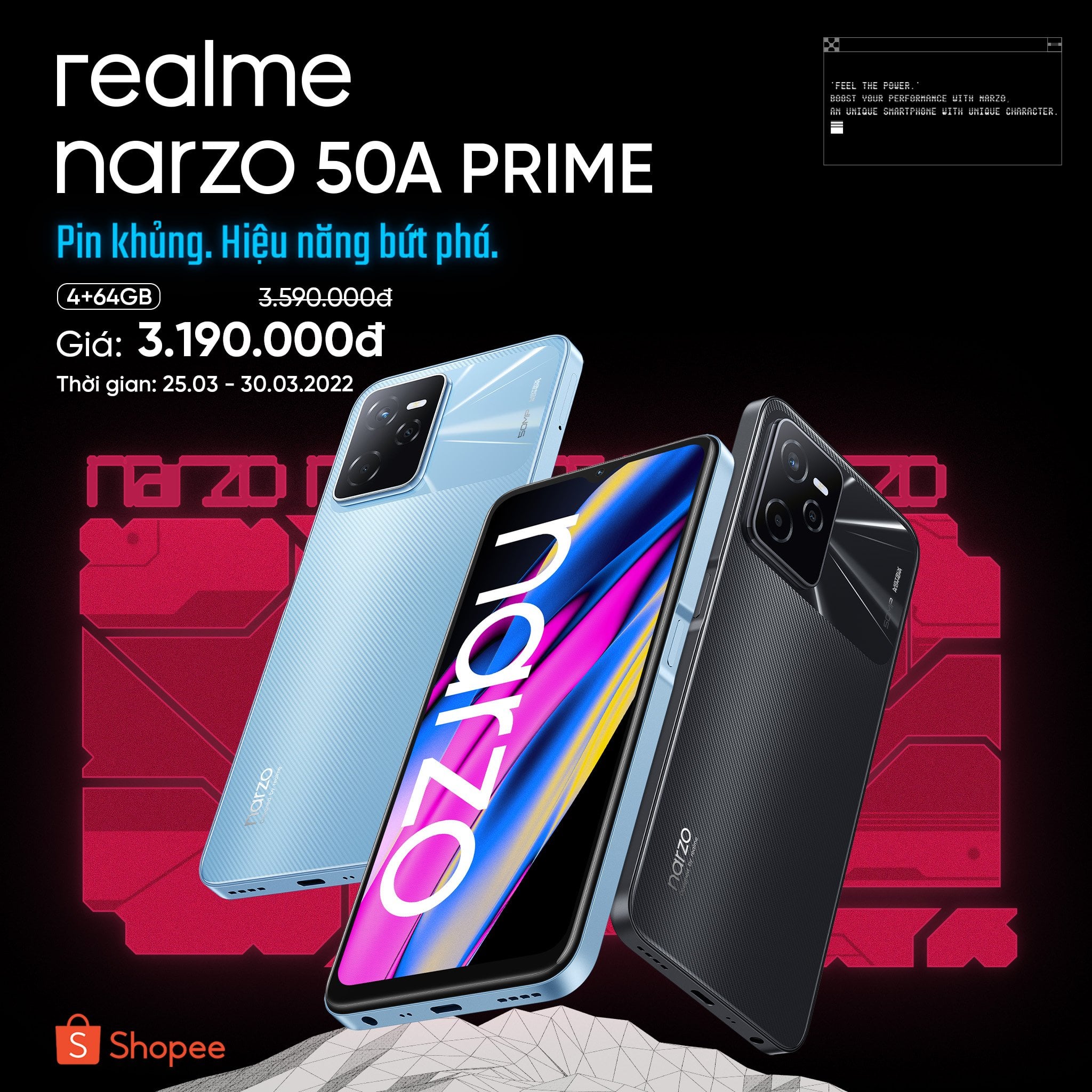 Dự kiến realme Narzo 50A Prime sẽ đến tay khách Việt từ ngày 25/3 tới. Nó sẽ là một áp lực thực sự lớn với Nokia C30 và dòng sản phẩm Redmi 10 sắp tới.