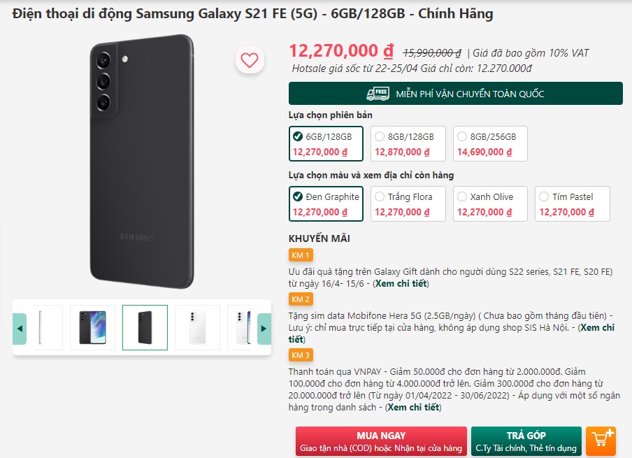Sở hữu thiết kế đơn giản nhưng sang trọng như những flagship S21 cao cấp nhưng đi kèm mức giá hấp dẫn và mới chỉ mới ra mắt hồi đầu tháng 1/2022, Galaxy S21 FE hiện là smartphone cao cấp có giá hấp dẫn nhất trên thị trường Việt Nam dù không được giảm giá nhiều. Galaxy S21 FE được xem là đối thủ nặng ký cho iPhone 11 và Xiaomi 11T Pro.