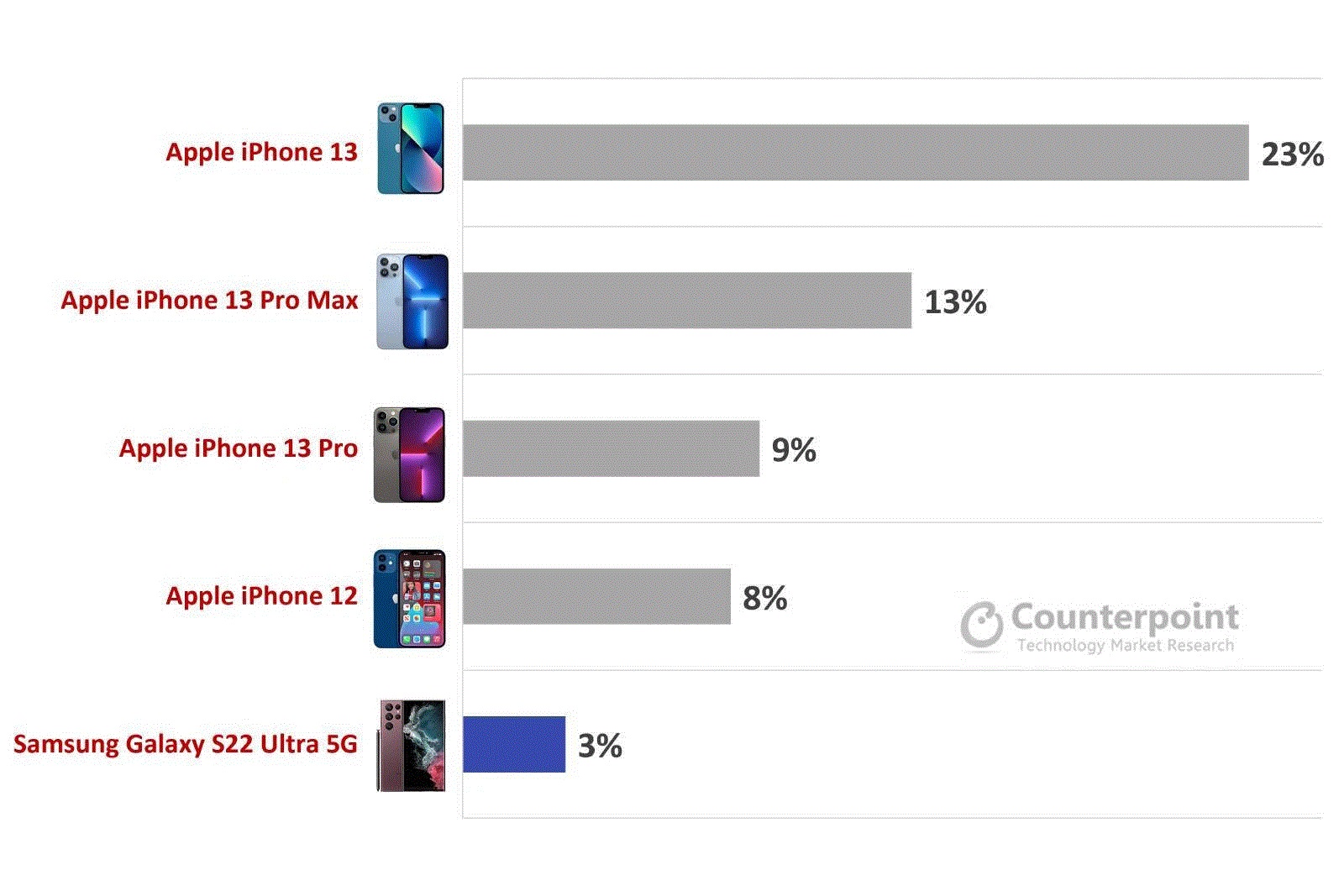 Trên cơ sở thiết bị riêng lẻ, iPhone 13 - hiện là điện thoại thông minh bán chạy nhất thế giới - hoàn toàn đánh bại các đối thủ của nó. Cứ 4 người mua điện thoại sẽ có một người mua iPhone 13.