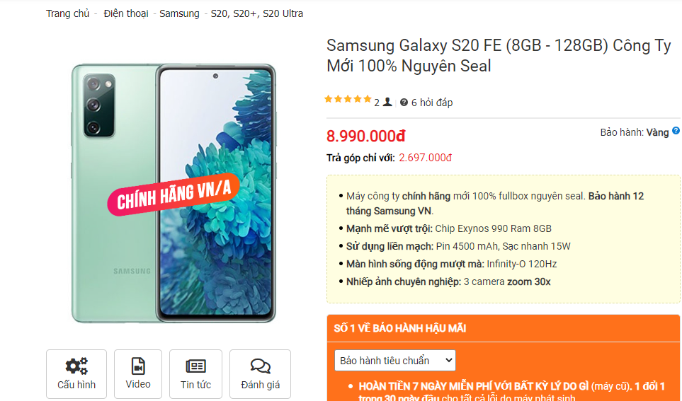 Mức giá của Galaxy S20 FE hiện tại thậm chí còn rẻ hơn cả chiếc smartphone tầm trung OPPO Reno6 5G (12.990.000 đồng) hay ngang với vivo V23 5G (12.490.000 đồng) mới ra mắt cách đây không lâu. Tuy nhiên cấu hình phần cứng của Galaxy S20 FE vẫn ở tầm "chiếu trên".