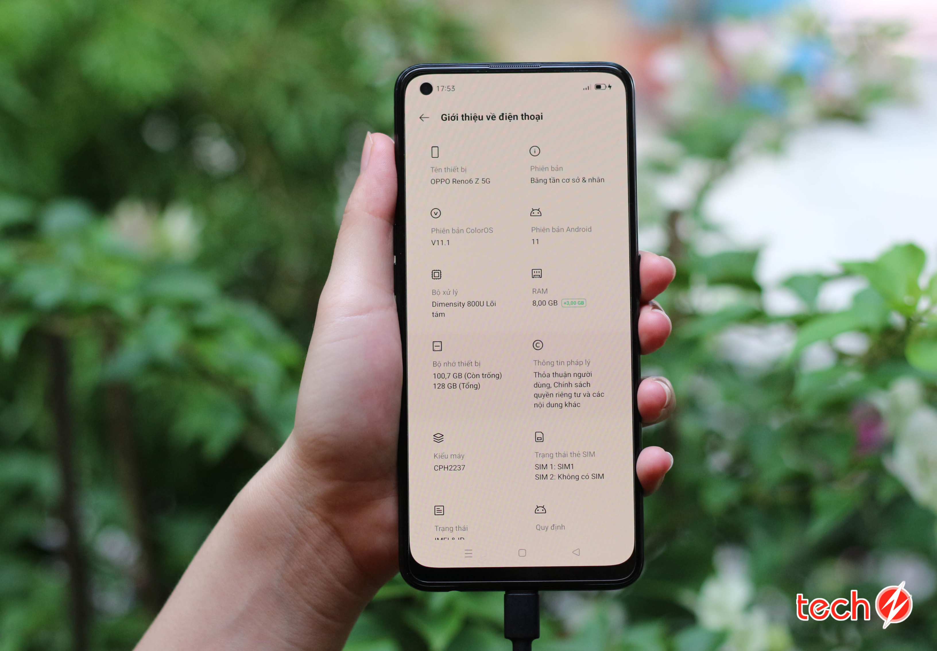 Trung tâm của Reno6 Z là chip Mediatek Dimensity 800U 5G. Đây là một trong những con chip 5G tốt nhất hiện nay ở phân khúc trung cấp. Đi kèm theo máy là RAM dung lượng 8GB và bộ nhớ trong 128GB. Về cơ bản đây đều là những phần cứng nổi bật trong phân khúc tầm trung.