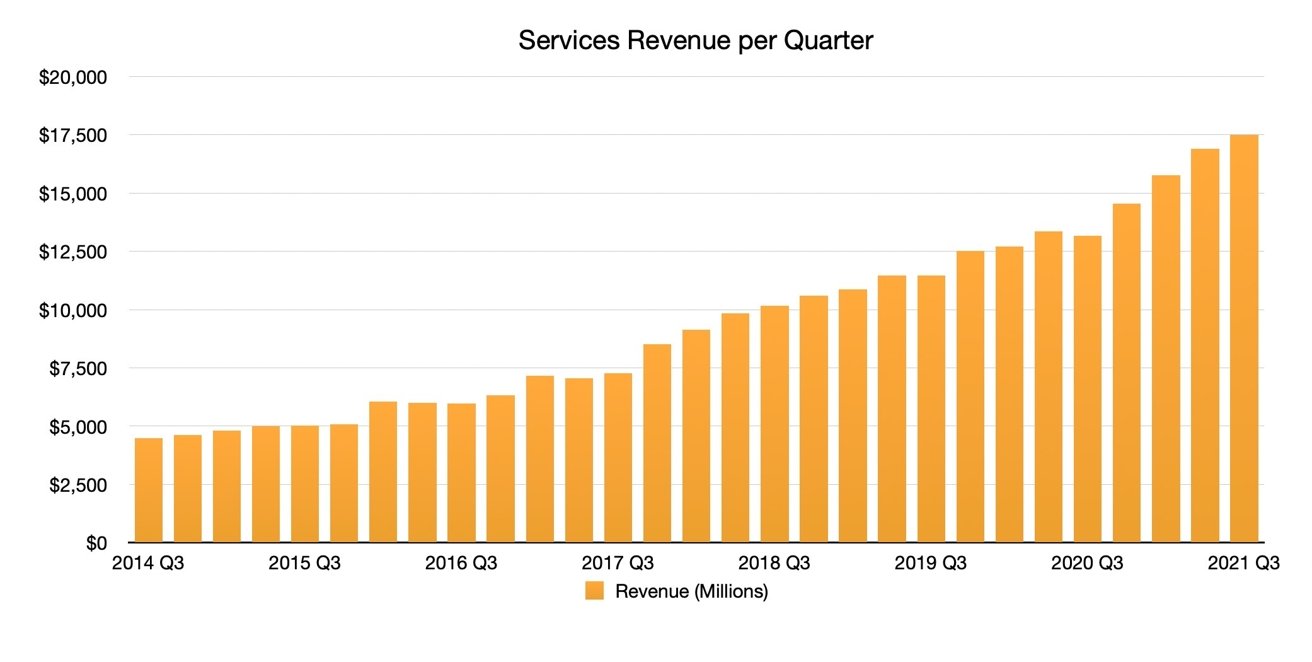 Apple mới đây đã chia sẻ kết quả kinh doanh quý 3 năm 2021 gây bất ngờ lớn với giới công nghệ. Sau khi thu về 17,5 tỷ USD từ mảng dịch vụ, mảng kinh doanh này hiện đang dẫn đầu tất cả các phân khúc ngoài iPhone nhờ tốc độ tăng trưởng vượt bậc.