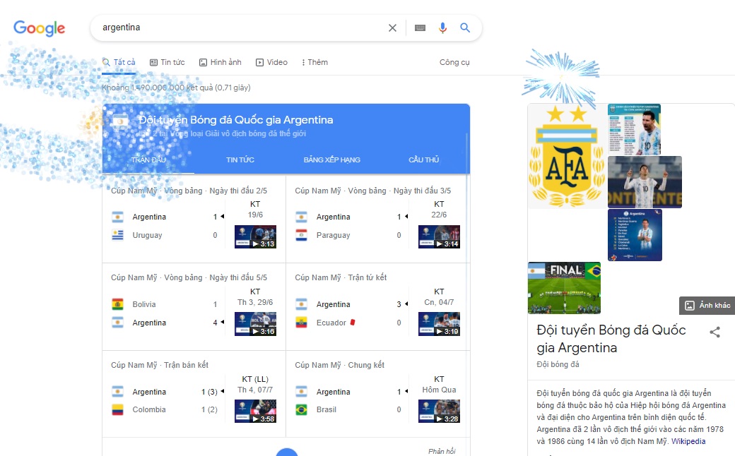 Trước đó, sau khi Messi và các đồng đội nâng cúp vô địch Copa America, khi tìm từ khóa Argentina, Google cũng tung ra hiệu ứng pháo hoa tương tự.