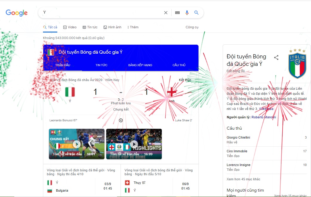 Đây là cách mà Google sử dụng để chúc mừng chức vô địch Euro 2021 cho đội tuyển Ý. Nếu tìm với từ khóa đôi tuyển Anh hay Euro 2021, hiệu ứng này sẽ không xuất hiện.