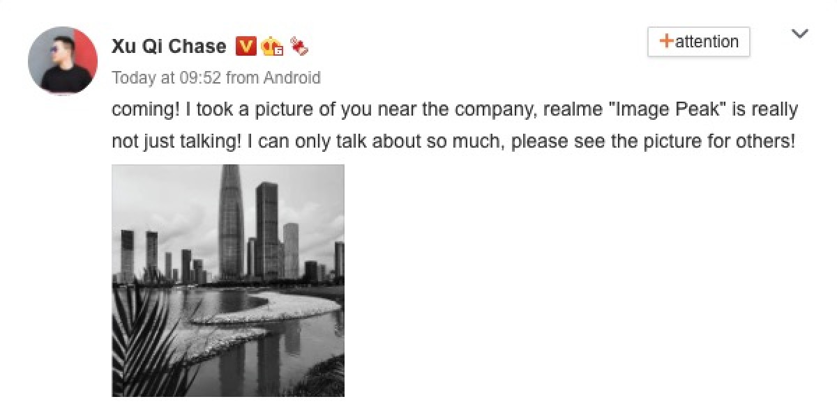 Mới đây chủ tịch Xu Qi Chase của Realme đã đăng một hình ảnh trên trang cá nhân Weibo úp mở việc nó đến từ một bức thiết bị đặc biệt chưa từng ra mắt. Tên của thiết bị này cũng được làm mờ một cách có chủ ý.