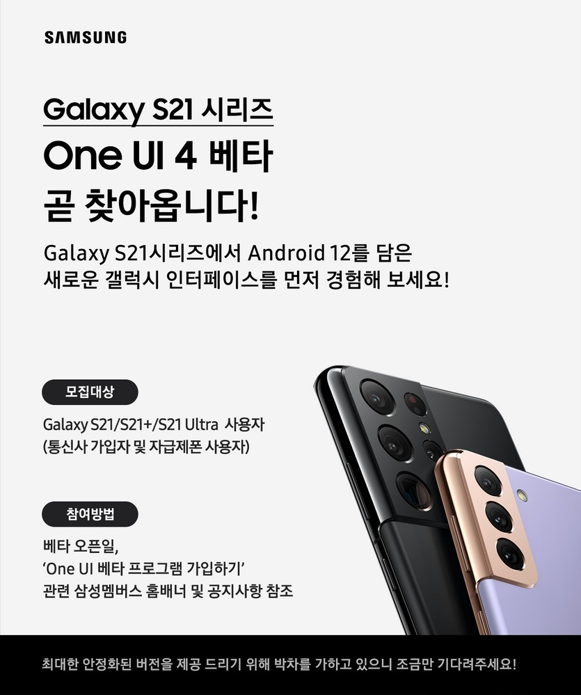 Chủ sở hữu Samsung Galaxy S21, S21 + và S21 Ultra được mời đăng ký chương trình beta. Chương trình này sẽ sớm có mặt trong thời gian tới. Tuy nhiên, hiện tại nó chỉ khả dụng cho người dùng ở Hàn Quốc. Lưu ý: cả điện thoại không dùng SIM và điện thoại mua từ nhà mạng đều có thể tham gia.