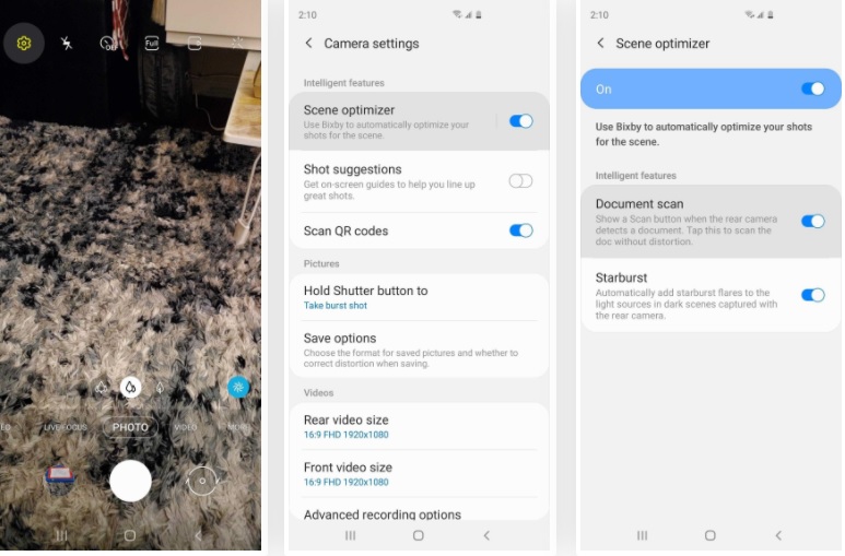 Tính năng này được bật theo mặc định sau khi bạn nhận được bản cập nhật One UI 2 (hay còn gọi là Android 10). Nhưng nếu bạn muốn kiểm tra kỹ, hãy chuyển đến cài đặt của ứng dụng Máy ảnh, chọn "Trình tối ưu hóa cảnh - Scene optimizer", sau đó đảm bảo "Quét tài liệu - Document scan" được chuyển thành bật.