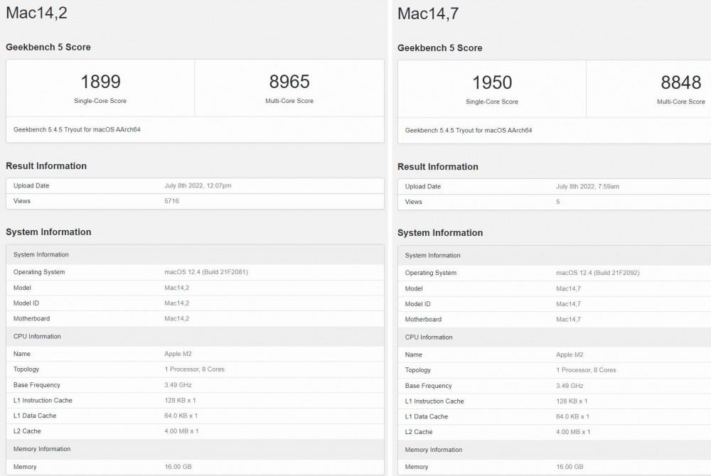 Trên Geekbench 5 được phát hiện bởi "Mr. Macintosh" trên Twitter , MacBook Air với chip M2 và 16GB bộ nhớ hợp nhất đạt điểm đơn lõi là 1.899 và điểm đa lõi là 8.965. Những điểm số này xấp xỉ với điểm số đạt được của MacBook Pro 13 inch với chip M2, xác nhận rằng các máy tính xách tay có hiệu suất hầu như giống hệt nhau trong thử nghiệm tổng hợp, như trường hợp của các mẫu M1.