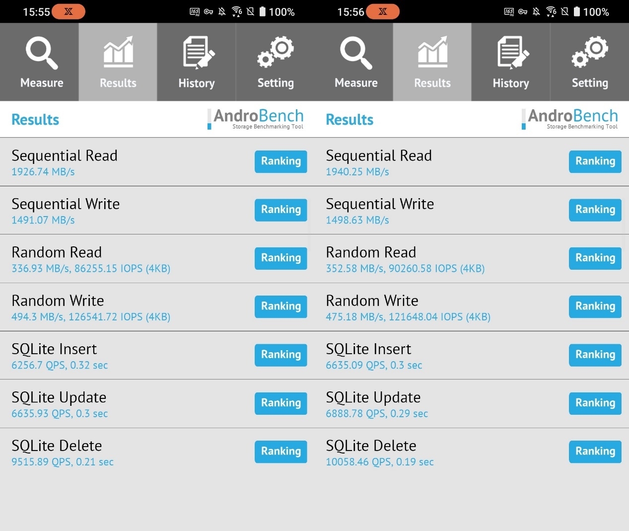 Trong bài kiểm tra Androbench, kết quả đọc tuần tự của điện thoại chơi game Tencent ROG 6 Pro là 1926MB / s, đọc ngẫu nhiên 4K là 336MB / s và ghi ngẫu nhiên 4K là 494MB / s.