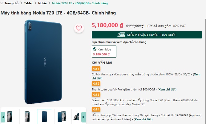 Nokia T20 đánh dấu sự trở lại của Nokia với thị trường máy tính bảng. Với cấu hình vừa đủ, giá bán không quá đắt và thương hiệu Nokia còn in đậm trong tâm trí người dùng, Nokia T20 rất dễ dàng nhận được sự quan tâm lớn. Trong tháng 7/2022, Nokia T20 tiếp tục giảm thêm ngày càng sát với mức 5 triệu đồng.