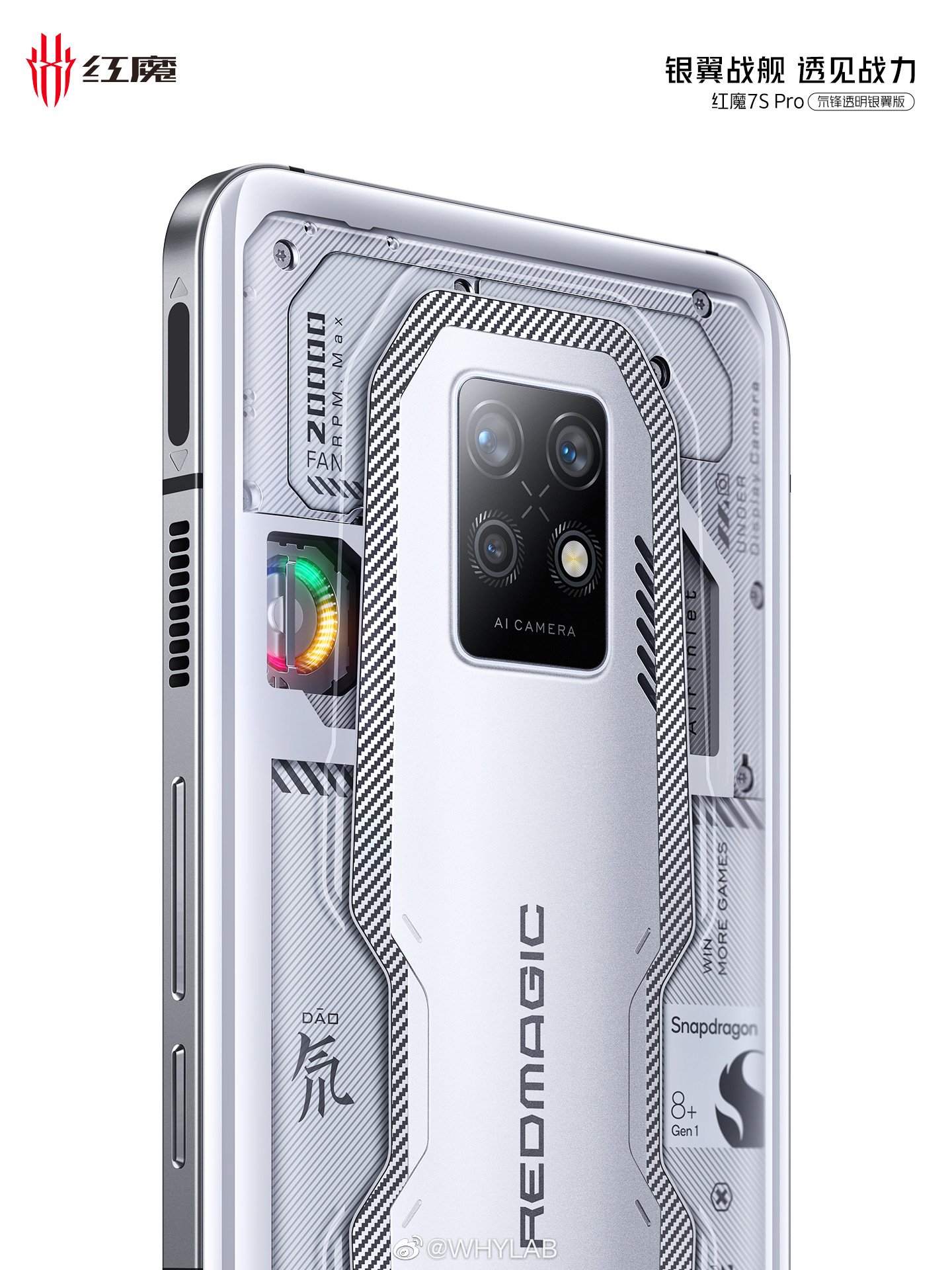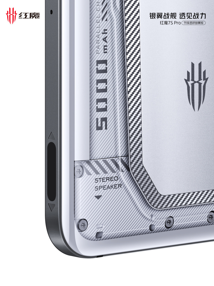 Phần còn lại của mặt sau điện thoại xác nhận rằng Red Magic 7S Pro được trang bị chipset Snapdragon 8+ Gen 1, pin 5.000mAh và công nghệ làm mát bằng chất lỏng ICE 10.0, có thể được kích hoạt bằng công tắc màu đỏ ở cạnh trái.