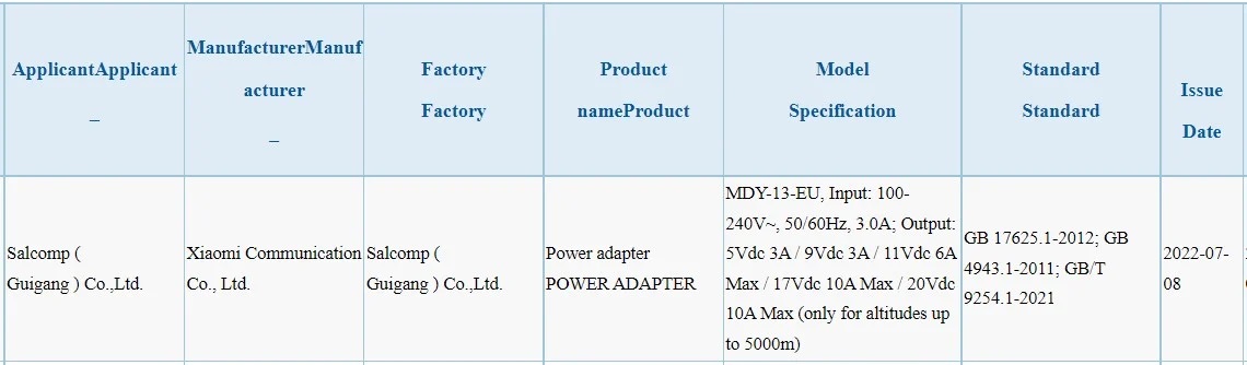 Nguyên nhân là do bộ sạc 200W của Xiaomi đã nhận được sự chấp thuận từ cơ quan 3C của Trung Quốc. Như đã thấy trong màn hình bên dưới, bộ chuyển đổi nguồn mới có số model MDY-13-EU đã có chứng nhận từ cơ quan quản lý 3C của Trung Quốc.