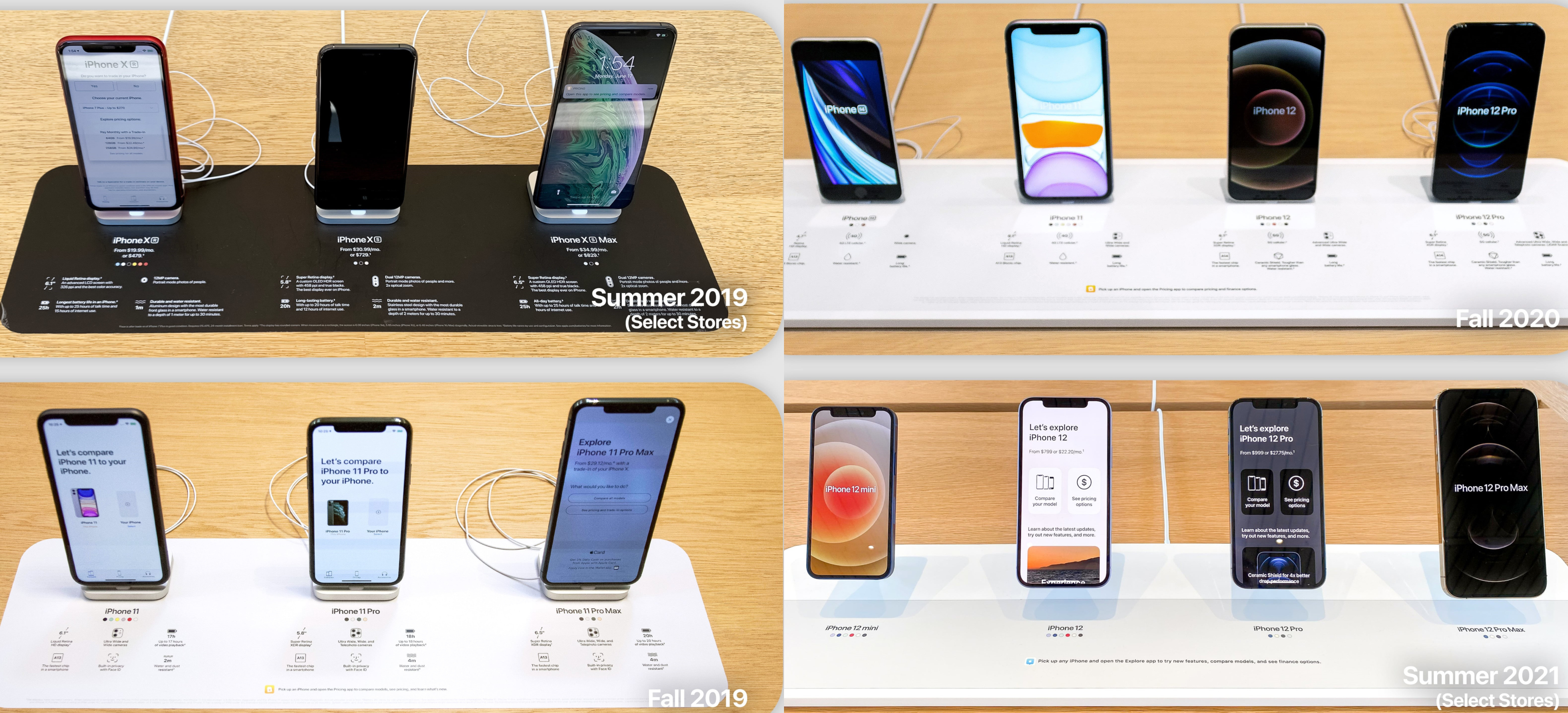 Trước đây, các bàn tại mọi cửa hàng Apple đều sử dụng các tấm lót bằng polycarbonate màu trắng với một dãy đầu nối Lightning để làm nổi bật những chiếc iPhone. Các phần mềm chứa thông tin sản phẩm, dây khóa sản phẩm lỏng lẻo và dây cáp sạc được cắm trực tiếp nhằm giữ cho những chiếc iPhone trưng bày luôn đầy pin.