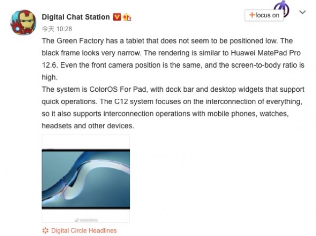 Chuyên gia rò rì tin tức công nghệ Digital Chat Station đã đưa lên Weibo để giới thiệu một số thông số kỹ thuật chính của máy tính bảng OPPO sắp ra mắt và một hình ảnh minh họa cho thấy máy tính bảng của OPPO sẽ trông như thế nào.