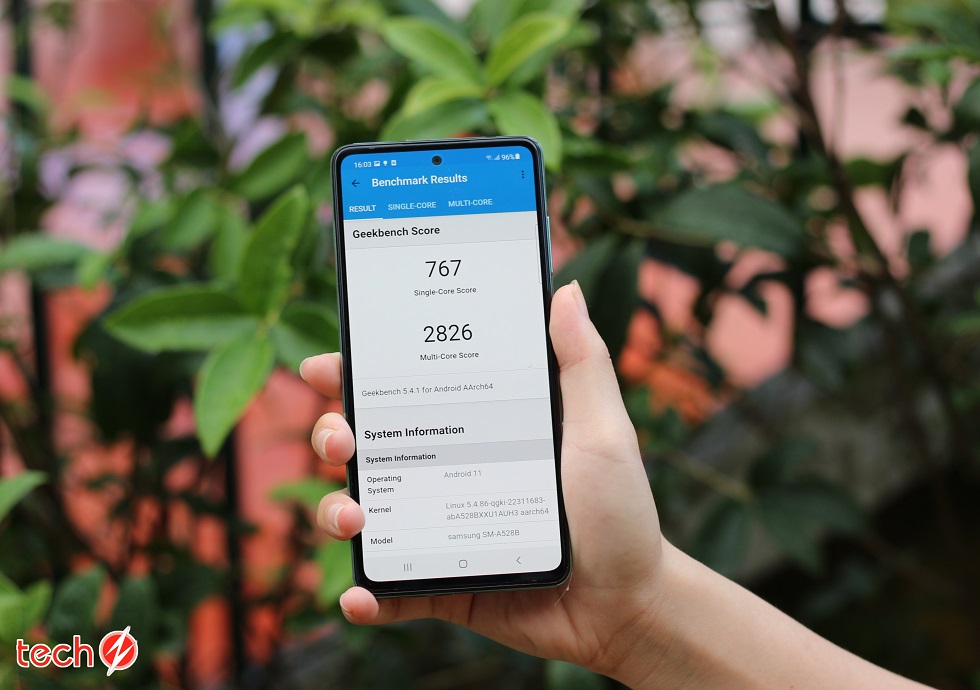 Với thử nghiệm Geekbench 5, máy cho 767 điểm đơn lõi và 2826 điểm đa lõi. Để so sánh, nó chỉ thấp hơn Galaxy Note 20 Ultra (dùng chip Snapdragon 865+) một chút. Như vậy, có thể thấy Galaxy A52s 5G tuy không mạnh bằng những flagship hiện tại nhưng nó ngang với một số Flagship năm ngoái.