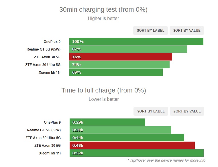 Bù lại cho pin, Axon 30 5G đi kèm bộ sạc 65W Power Delivery và pin 4.200 mAh. Chỉ trong 30 phút, chiếc điện thoại này đã sạc từ 0 đến 76%, trong khi sạc đầy chỉ mất 48 phút. Kết quả khá ấn tượng.