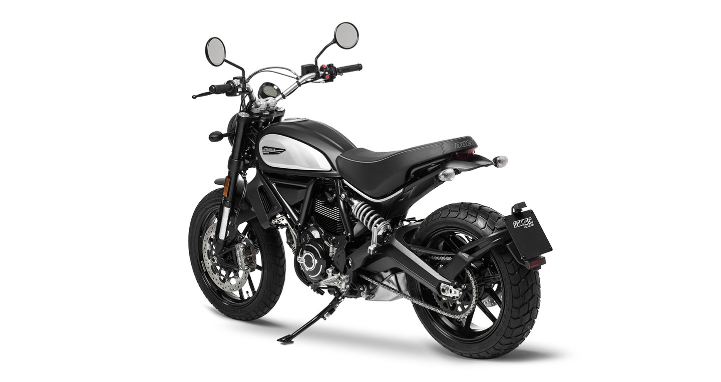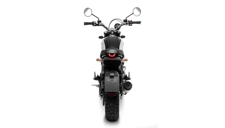 Gắp sau bằng nhôm màu đen, bộ gương hậu dạng tròn màu đen, mâm hợp kim 10 chấu màu đen kết hợp bộ lốp xe Pirelli MT60 RS lấy cảm hứng từ dòng Enduro khá đặc trưng của phiên bản Scrambler Icon.