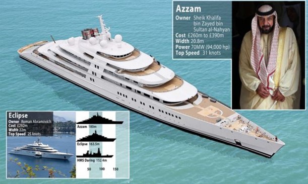 9. Chưa rõ quyền sở hữu nhưng du thuyền Azzam là siêu du thuyền tư nhân lớn nhất thế giới với giá 600 triệu USD. Chiếc du thuyền đặc biệt này chứa tàu ngầm riêng và hệ thống phòng thủ tên lửa.
