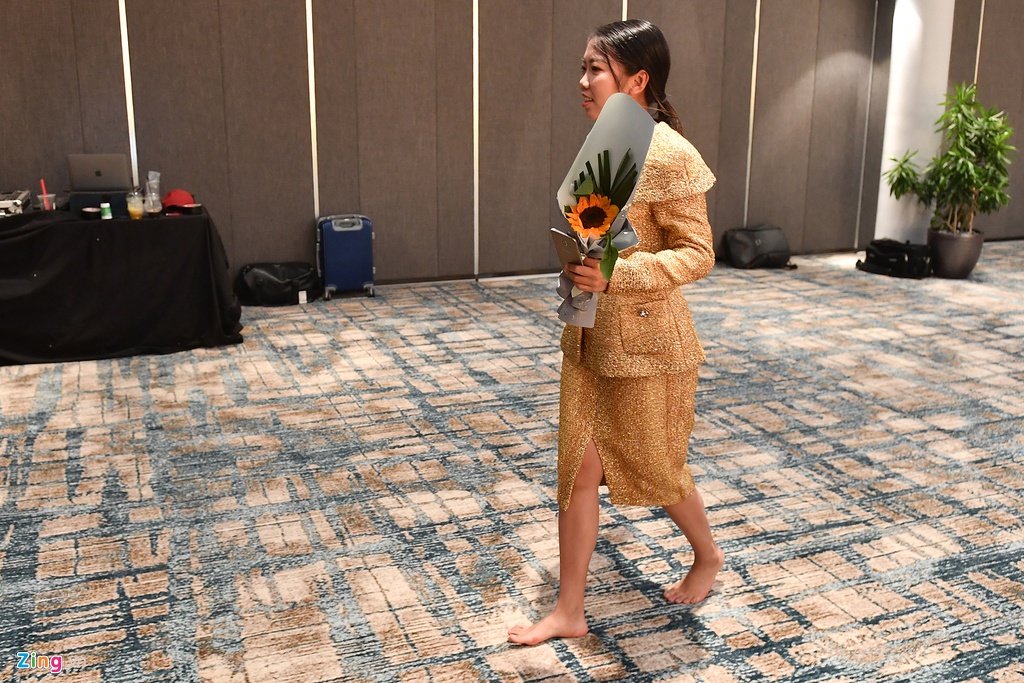 Huỳnh Như bỏ giày xách tay và đi chân đất khi di chuyển từ hội trường lễ nhận thưởng về phía khu vực tổ chức tiệc.