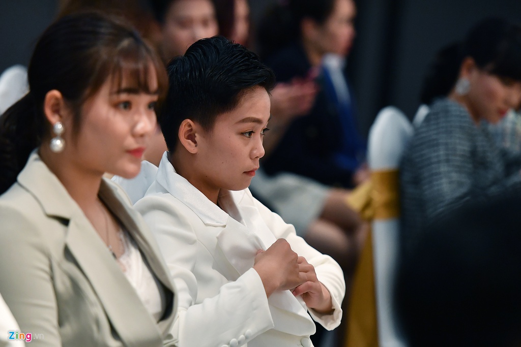 Tỏ ra không quen với bộ vest trắng, tiền vệ Trần Thị Phương Thảo hết cởi khuy ra lại cài vào khi ngồi do bị chật.