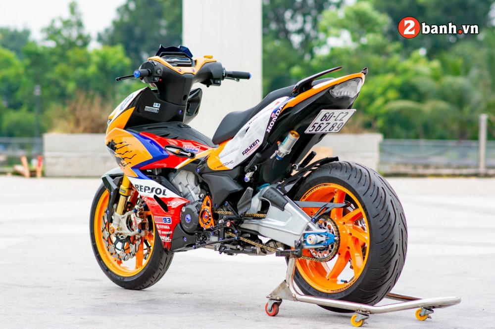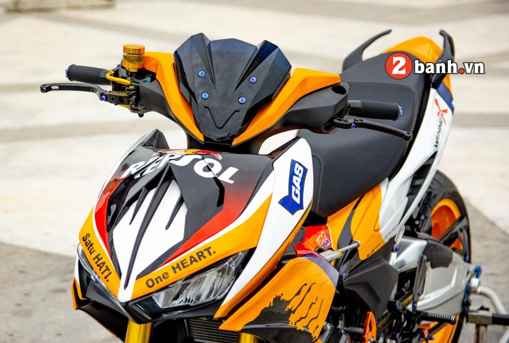 Đầu tiên là dàn áo cực đặc biệt với phong cách Repsol, bộ áo sơn Airbrush được thực hiện tại Ab Miracle. Từng chi tiết trên bộ áo khẳng định sự tỉ mỉ, cất công. Ở vị trí mặt nạ đã được tạo hình lại với nhiều đường nét gân guốc dứt khoát & thể thao hơn.