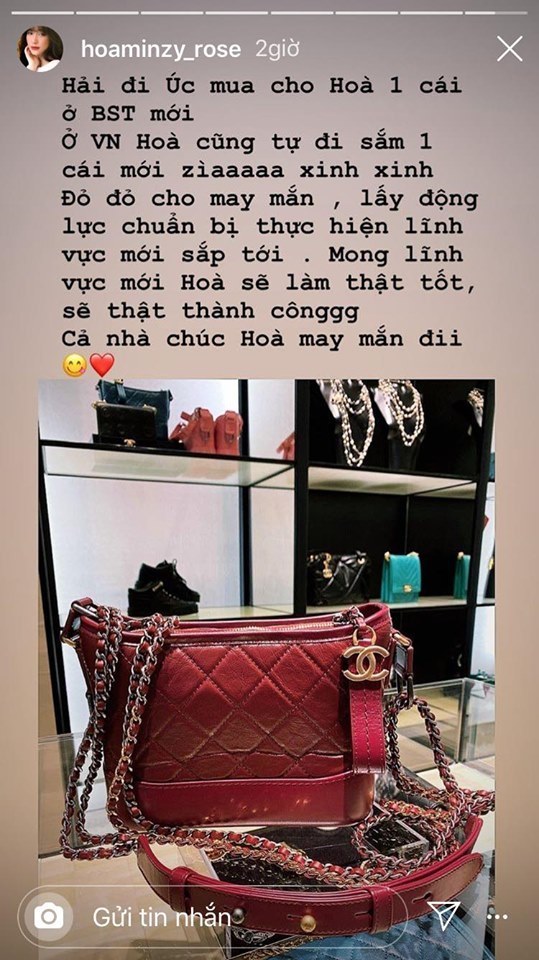 Bên cạnh việc chi tiền tỷ để mua nhà, trên trang cá nhân của Hòa Minzy còn thường xuyên khoe những món hàng hiệu đắt tiền mà nữ ca sĩ sở hữu. Những ai theo dõi Instagram của Hòa Minzy chắc chắn không hề lạ lẫm gì khi thấy hình ảnh cô diện những chiếc túi hàng hiệu. Mỗi lần xuất hiện, bên cạnh nữ ca sĩ lại là một mẫu túi đắt tiền khác nhau. Không những thế, Hòa Minzy còn thường xuyên check in khi đi mua xắm ở những khu phố đắt đỏ nổi tiếng thế giới.