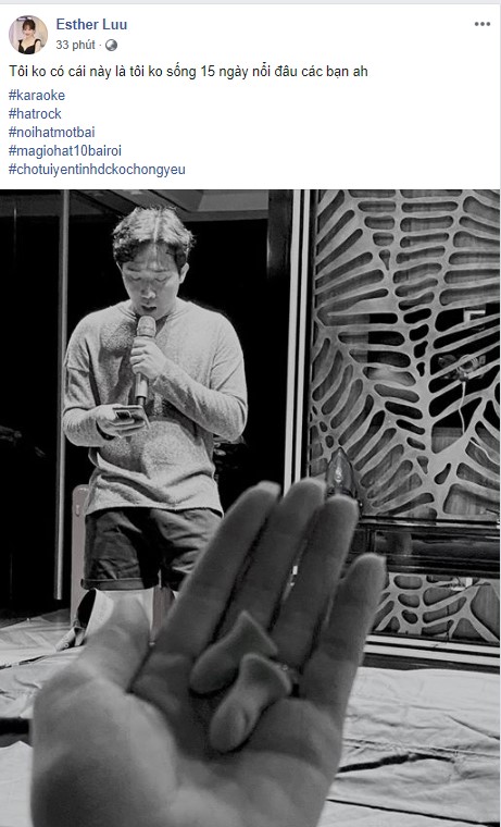 Mới đây, trên trang Facebook cá nhân của mình, nữ ca sĩ đã đăng tải bức ảnh ông xã của mình đang cầm mic đứng hát trong phòng. Tuy nhiên, điều đáng chú ý là trên tay Hari Won lại cầm một đôi nút bịt tai. Cùng với bức ảnh này là dòng trạng thái than vãn của giọng ca Anh cứ đi đi: “Tôi ko có cái này là tôi ko sống 15 ngày nổi đâu các bạn ah”.
