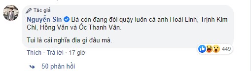 Tuy nhiên, sự việc vẫn chưa dừng lại ở đây khi trong phần bình luận, Nguyễn Sin liên tục hé lộ thêm những tình tiết mới về sự việc. Theo Nguyễn Sin, không chỉ có mình là mục tiêu “tấn công” của mẹ Mai Phương mà ngay cả những nghệ sĩ nổi tiếng như Hoài Linh, Trịnh Kim Chi, Hồng Vân và Ốc Thanh Vân cũng là đích ngắm của bà.