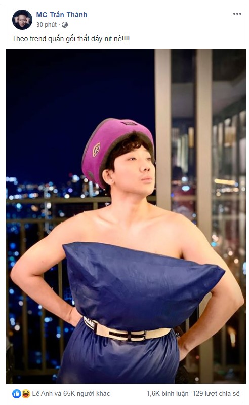 Đứng trước trào lưu mới đang rất “hot” này, Trấn Thành cũng đã quyết định tham dự thử thách. Mới đây, trên trang fanpage của mình, nam danh hài đã đăng tải bức ảnh diện “váy gối” cực chất. Bức ảnh mà Trấn Thành đăng tải nhanh chóng thu hút được sự chú ý của đông đảo cư dân mạng.