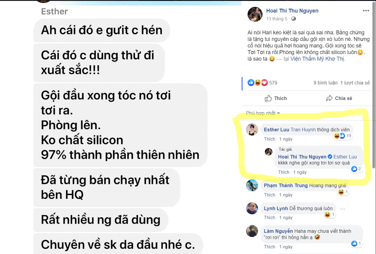 Trên trang cá nhân của mình, Hoa hậu Thu Hoài đã đăng tải ảnh chụp màn hình đoạn tin nhắn của Hari Won cùng dòng trạng thái bày tỏ sự thắc mắc, hoang mang của mình: “Ai nói Hari keo kiệt là sai quá sai nha. Bằng chứng là tặng tui nguyên cặp dầu gội xịn xò luôn nè. Nhưng cổ nói hiệu quả hơi hoang mang. Gội xong tóc sẽ Tơi Tơi ra rồi Phòng lên không chất silicon luôn. là sao ta”.