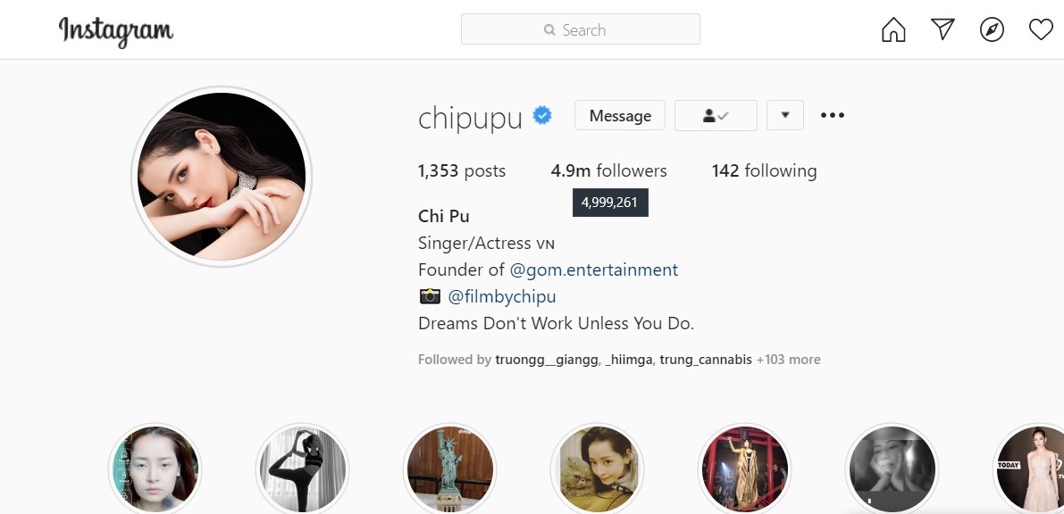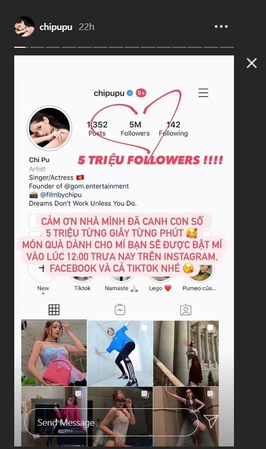 Vào trưa qua, Chi Pu đã vui mừng thông báo tài khoản Instagram của cô chính thức đạt tới cột mốc 5 triệu lượt theo dõi. Với thành tích này, Chi Pu đã trở thành nghệ sĩ thứ hai của showbiz Việt có được 5 triệu lượt theo dõi trên Instagram (Chỉ sau Sơn Tùng M-TP). Chi Pu cũng đã vượt mặt Ngọc Trinh để trở thành sao nữ có lượt theo dõi nhiều nhất trên mạng xã hội này.