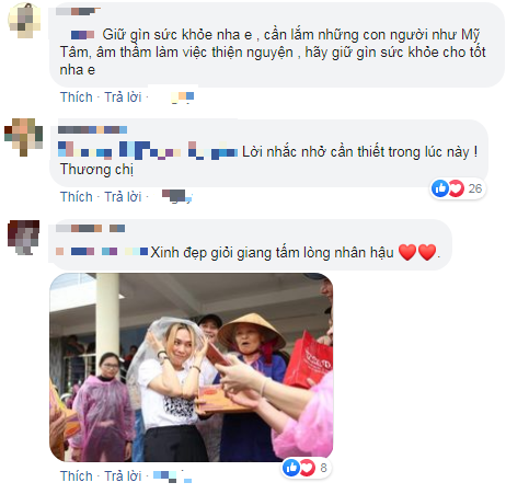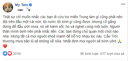 “Thật sự chỉ muốn nhắc các bạn đi cứu trợ miền Trung làm gì cũng phải nên đội trên đầu một cái nón, lội nước lội sình gì cũng được nhưng cố gắng đừng để đầu ướt mưa, nó sẽ hành sốt, ho và nghẹt cứng mũi luôn. Người thân mình bịnh nên phải nhắc liền. Các bạn đừng chủ quan một chút nào nha. Mong tất cả mọi người khoẻ mạnh để hỗ trợ nhau lúc này. Cầu Trời thương mưa bão lũ sẽ không về nữa. Nhất định mọi người sẽ bình yên!” – Mỹ Tâm chia sẻ.