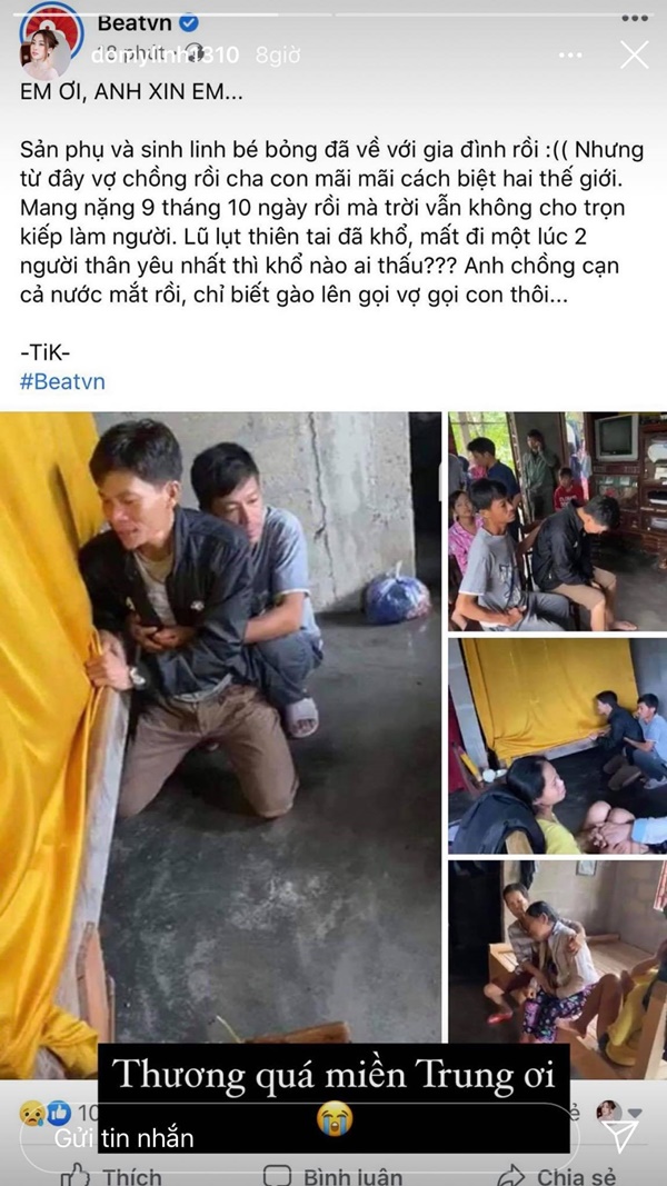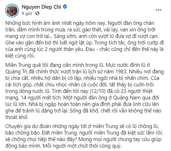 Trên trang cá nhân, nữ MC viết dòng trạng thái dài: "Những bức hình ám ảnh nhất ngày hôm nay. Người đàn ông chân trần, dầm mình trong mưa, ra sức gào thét, vái lạy, van xin ông trời mang vợ con trở lại... Sáng sớm, anh còn vượt lũ đưa vợ đi vượt cạn. Ghe vào gần đến bờ thì bất ngờ lật úp. Trong tích tắc, ông trời cướp đi của anh cùng lúc 2 người thân yêu. Đau - chắc cũng chỉ đến thế này là kiệt cùng rồi".