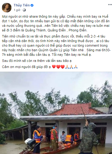 Không chỉ Đỗ Mỹ Linh và sao Việt, hàng triệu trái tim đều xót xa cho những câu chuyện thương tâm xảy ra trong thời gian qua giữa bão lũ. Mới đây, Lý Hải Minh Hà đã vận động được hơn nửa tỷ đồng, MC Đại Nghĩa góp 60 triệu đồng, Hoa hậu H'Hen Niê chuyển khoản 50 triệu đồng, Thủy Tiên cũng đã vào cuộc, chỉ trong 2 tiếng đã vận động quyên góp được 2 tỷ đồng. Nữ ca sĩ hứa sẽ đến miền Trung trong thời gian sớm nhất để san sẻ nỗi khó khăn với người dân.