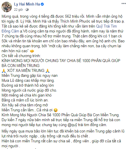 Hi vọng sự chung tay đó sẽ phần nào giảm thiểu thương đau cho đồng bào miền Trung. Dưới dây, là thông tin ủng hộ cho bà con miền Trung do ca sĩ Lý Hải, Minh Hà phát động: